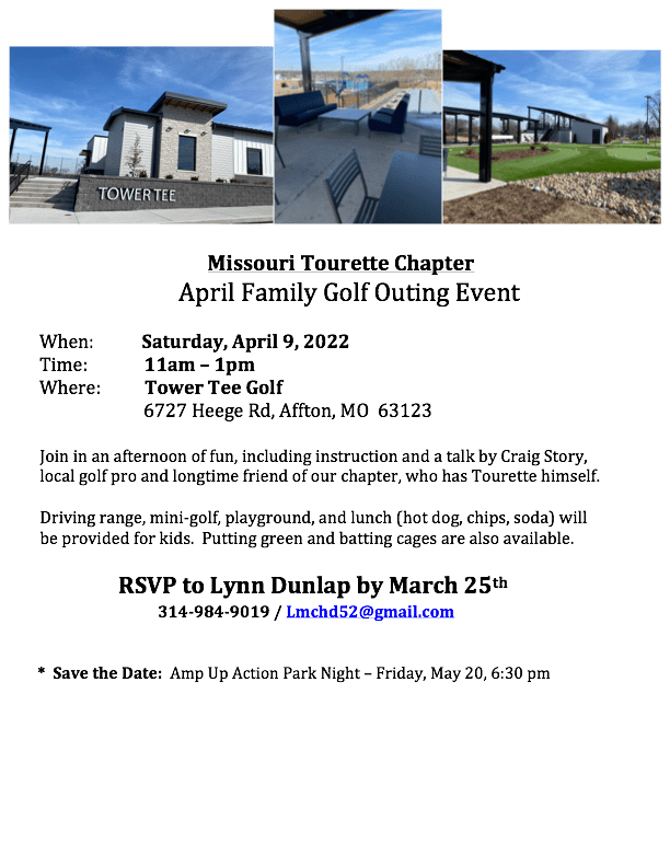 Join in an afternoon of fun, including instruction and a talk by Craig Story, local golf pro and long time friend of our chapter, who has Tourette himself. Driving range, mini-golf, playground and lunch will be provided for kids. A putting green and batting cages are also available.